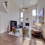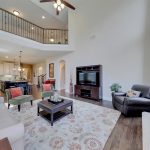 Just beyond the kitchen is a large breakfast area with wood floors and access to the backyard and the main living area. This living area has a 2-story ceiling with lots of windows, a pretty cast stone gas fireplace for chilly nights, and a second access point to the backyard.