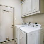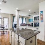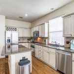 The kitchen is open to the living room and boasts granite counters, tumbled marble backsplash, stainless steel appliances, and a large granite topped island with space for guests to sit while visiting in the kitchen.
