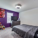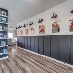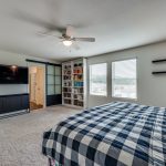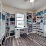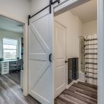 Behind the living room is the downstairs bedroom, currently being used as a craft room and full hall bath with adorable upgraded barn door.